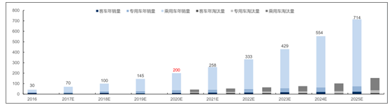 考慮2020年新能源汽車規(guī)劃累計(jì)銷量將超過(guò)500萬(wàn)輛,2016~2020年年均增速將達(dá)61%;以五年為一個(gè)淘汰周期,從2020年開始測(cè)算新能車淘汰量;2025年新能車產(chǎn)銷占比達(dá)20%的規(guī)劃目標(biāo)(2016汽車銷量2800萬(wàn)輛),我們預(yù)計(jì)2025年新能源汽車銷量將達(dá)700萬(wàn)輛。
