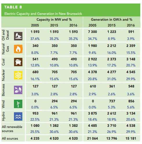 在新不倫瑞克省(New Brunswick),生物質(zhì)發(fā)電裝機(jī)容量保持在127MW,占總裝機(jī)容量的2.8%,而生物質(zhì)發(fā)電量從2015年的361GWh增加到2016年的548GWh,占發(fā)電總量的3.6%。