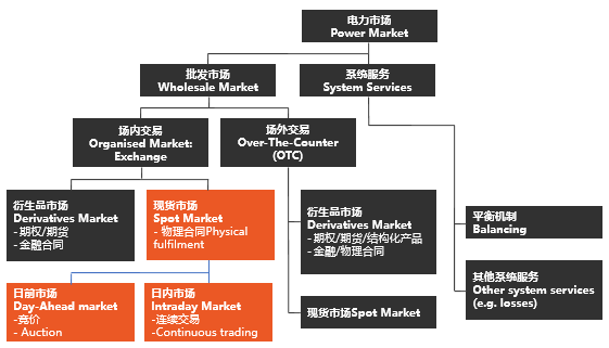 電力市場分為很多個細分市場,下圖展示了電力市場的全貌,EPEX SPOT負責橙色標記的市場。電力市場從結構上分為批發(fā)市場和系統(tǒng)服務,批發(fā)市場主要把電力進行商品化,更強調其經濟屬性,包括場內交易和場外交易,場內又分為現(xiàn)貨市場和衍生品市場,現(xiàn)貨市場分為日前市場和日內市場;而系統(tǒng)服務是輸電網運營的市場,目的是維護整個系統(tǒng)的平衡與安全。