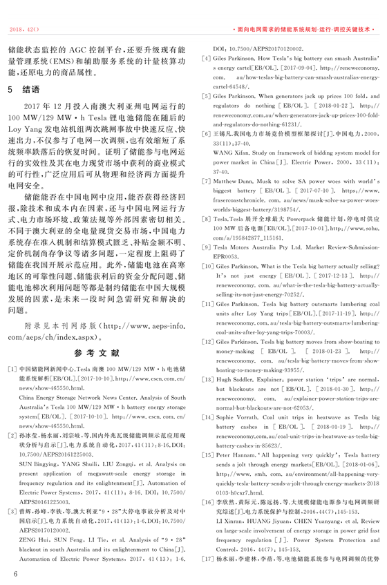 2017年12月1日,100 MW/129 MW·h 特斯拉鋰電池儲(chǔ)能電站在澳大利亞南澳州投運(yùn),并于2017年12月14日和2018年1月18日維多利亞州的LoyYang發(fā)電站機(jī)組跳閘事故中跨區(qū)參與電網(wǎng)調(diào)頻。首先,分析了特斯拉(Tesla)儲(chǔ)能電池投入澳大利亞電網(wǎng)運(yùn)行的物理和經(jīng)濟(jì)原因,介紹電池的結(jié)構(gòu)及控制策略,Tesla儲(chǔ)能投運(yùn)后的運(yùn)行狀況;然后,從制定中國(guó)儲(chǔ)能參與電網(wǎng)運(yùn)行技術(shù)標(biāo)準(zhǔn)和評(píng)價(jià)體系、發(fā)揮儲(chǔ)能部分替代火電機(jī)組一次調(diào)頻的能力、借鑒國(guó)外快速調(diào)頻輔助服務(wù)模式、探索儲(chǔ)能自盈利商業(yè)模式等角度深入探討Tesla儲(chǔ)能運(yùn)行對(duì)中國(guó)儲(chǔ)能技術(shù)及電網(wǎng)的啟示和借鑒意義。