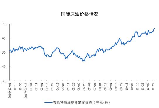 原油價(jià)格持續(xù)回升。12月份,布倫特原油現(xiàn)貨離岸價(jià)格整體保持上漲趨勢(shì)。截至12月29日,價(jià)格為66.7美元/桶,比11月底上漲3.2美元/桶。