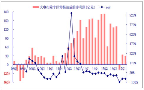 2017年1-6月,火電行業(yè)實(shí)現(xiàn)扣非凈利潤(rùn)63.9億元,較去年同期銳減76%。二季度扣非凈利潤(rùn)29.8億元,同比減少76.5%,環(huán)比下降12.7%。
