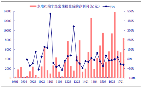 2017年1-6月,水電行業(yè)實(shí)現(xiàn)扣非凈利潤(rùn)138.1億元,同比下降7.9%;二季度83.6億元,同比降低10.6%,環(huán)比大幅增長(zhǎng)55.4%。