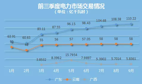 前三季度,廣東電力市場交易量為813.06億千瓦時(shí)創(chuàng)最高,云南、貴州、廣西電力市場交易量分別為491.05億千瓦時(shí)、260.7223億千瓦時(shí)、55.674億千瓦時(shí)。2017年售電公司在整個(gè)廣東市場上成交電量達(dá)到1138億千瓦時(shí)。
