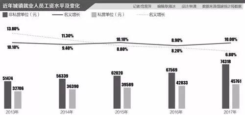 國(guó)企工資決定機(jī)制市場(chǎng)化加速有著現(xiàn)實(shí)考量。國(guó)家統(tǒng)計(jì)局?jǐn)?shù)據(jù)顯示,去年全國(guó)城鎮(zhèn)非私營(yíng)單位就業(yè)人員年平均工資為74318元, 同比名義增長(zhǎng)10%,增速比2016年加快1.1個(gè)百分點(diǎn)??鄢飪r(jià)因素,實(shí)際增長(zhǎng)8.2%。而當(dāng)年全國(guó)城鎮(zhèn)私營(yíng)單位就業(yè)人員年平均工資為45761元,同比名義增長(zhǎng)6.8%,實(shí)際增長(zhǎng)5%??梢?jiàn)在我國(guó),非私營(yíng)單位工資,無(wú)論是工資總額還是名義增速和實(shí)際增速都遠(yuǎn)遠(yuǎn)高于私企。