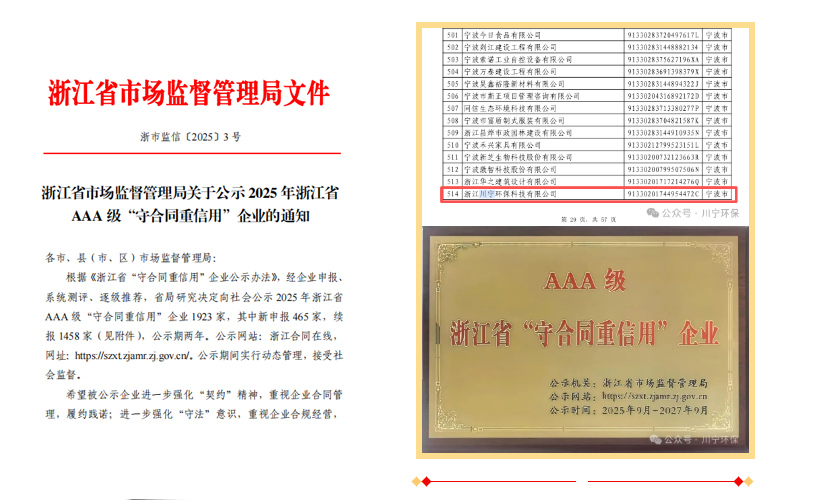 川寧環(huán)保再次榮獲2025年浙江省AAA級“守合同重信用”企業(yè)稱號