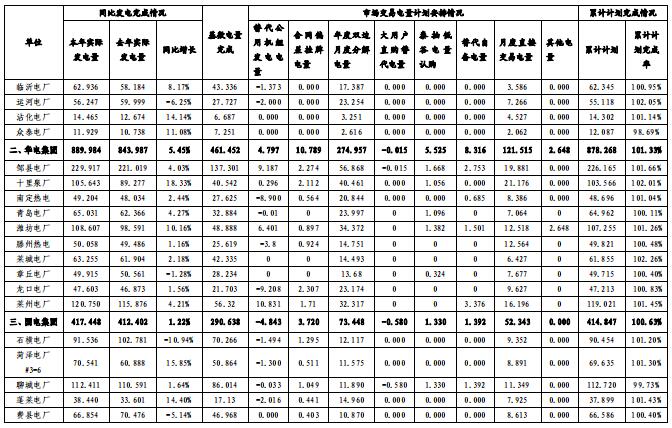 2018年度,直調(diào)公用電廠(不含泰抽電站、興達(dá)熱電、海陽核電、八角熱電)實際完成發(fā)電量2788.062億千瓦時,同比增長4.46%,完成累計計劃的101.09%,具體情況詳見表12。