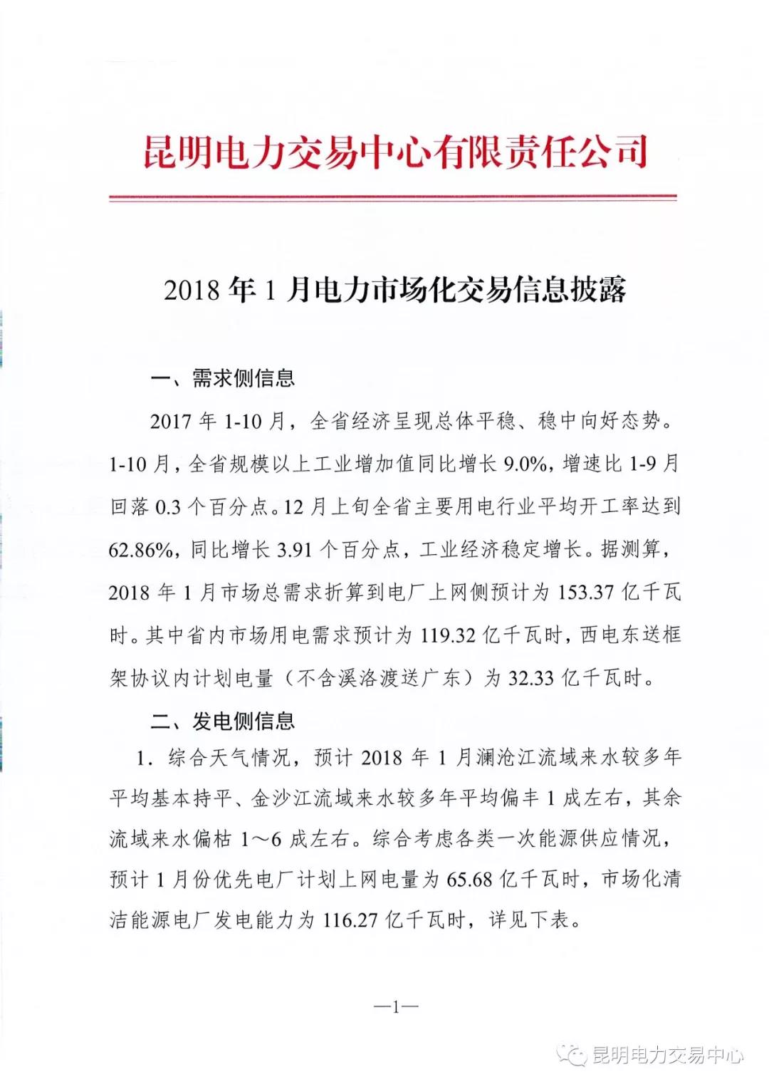 云南2018年1月電力市場化交易信息披露:1月省內(nèi)市場可競價電量約65億千瓦時