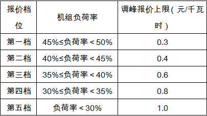 第二十一條 深度調(diào)峰交易采用階梯式、分機(jī)組報(bào)價(jià),以機(jī)組各檔負(fù)荷率作為一個(gè)報(bào)價(jià)區(qū)間,隨負(fù)荷率降低而增加,其中下一檔報(bào)價(jià)不得低于上一檔報(bào)價(jià)。具體負(fù)荷率分檔及報(bào)價(jià)上限見下表。