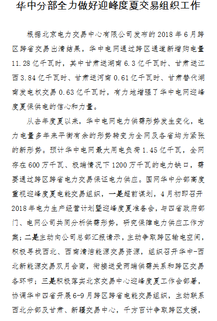 從去年度夏以來,華中電網(wǎng)電力供需形勢(shì)發(fā)生變化,電力電量多年來平衡有余的形勢(shì)轉(zhuǎn)變?yōu)槿W(wǎng)及各省均為緊張的新形勢(shì)。預(yù)計(jì)華中電網(wǎng)最大用電負(fù)荷1.45億千瓦,全網(wǎng)存在600萬千瓦、極端情況下1200萬千瓦的電力缺口,需要通過跨區(qū)跨省電力交易保證電力供應(yīng)。國(guó)網(wǎng)華中分部高度重視迎峰度夏電能交易組織,一是超前謀劃,4月初即召開2018年電力生產(chǎn)經(jīng)營(yíng)計(jì)劃暨迎峰度夏準(zhǔn)備會(huì),與四省政府部門、電網(wǎng)公司共同分析供需形勢(shì),研究保障電力供應(yīng)工作方案;二是主動(dòng)向公司總部匯報(bào)請(qǐng)示,主動(dòng)爭(zhēng)取跨區(qū)輸電空間,積極尋找西北、西南清潔能源交易資源,組織召開華中-西北新能源交易雙月會(huì)商,銜接送受兩端供需關(guān)系和跨區(qū)交易各環(huán)節(jié);三是積極落實(shí)北京交易中心迎峰度夏工作會(huì)部署,協(xié)調(diào)華中四省開展6-9月跨區(qū)跨省電能交易組織,主動(dòng)聯(lián)系西北分部及甘肅、新疆交易中心,千方百計(jì)爭(zhēng)取跨區(qū)支援,填補(bǔ)華中電網(wǎng)用電缺口。在年度跨區(qū)計(jì)劃安排的基礎(chǔ)上,增加送華中電力170萬千瓦、電量30.5億千瓦時(shí);四是創(chuàng)新交易機(jī)制,積極與湖南協(xié)商利用黑麋峰抽蓄電站消納西北低谷新能源,力爭(zhēng)完成5億購(gòu)電量,達(dá)成湖南首筆發(fā)電權(quán)跨區(qū)交易,交易電量0.63億千瓦時(shí),實(shí)現(xiàn)了湖南電網(wǎng)跨區(qū)發(fā)電權(quán)交易歷史性突破。
