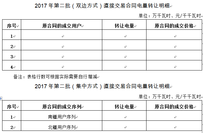 (3)針對2017年上半年新增電量雙邊交易合同電量轉(zhuǎn)讓明細,若存在同一發(fā)電企業(yè)與同一用戶以不同電價成交,需分別填寫原合同中每個成交價格對應(yīng)的電量,否則交易申報數(shù)據(jù)作廢。