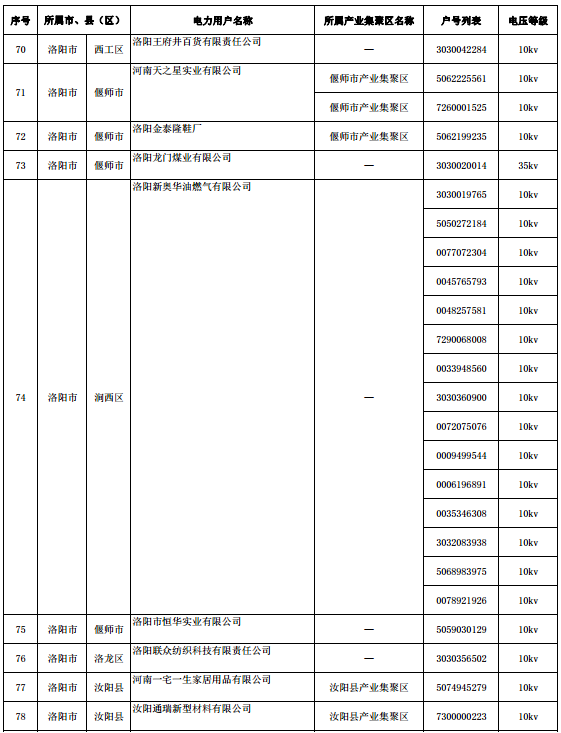 河南新公示第六批212家電力用戶(附名單)