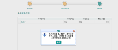 所有機(jī)組添加完畢后,點(diǎn)擊完成,即可完成本次注冊(cè)。點(diǎn)擊【完成注冊(cè)】按鈕將提交審核,系統(tǒng)自動(dòng)退出注冊(cè)界面回到首頁(yè),等待交易中心審批。沒(méi)有添加完成請(qǐng)不要點(diǎn)【完成注冊(cè)】按鈕。