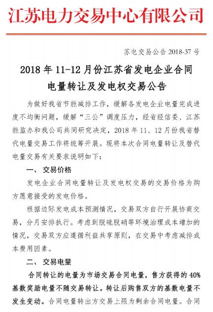 江蘇2018年11-12月發(fā)電企業(yè)合同電量轉(zhuǎn)讓及發(fā)電權交易:售方獲得的40%基數(shù)獎勵電量不隨交易轉(zhuǎn)讓