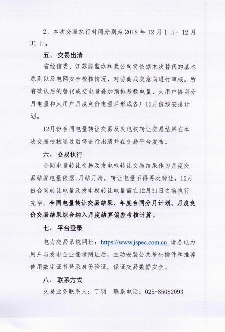 江蘇2018年12月發(fā)電側(cè)替代及合同電量轉(zhuǎn)讓調(diào)整交易11月26日申報(bào)