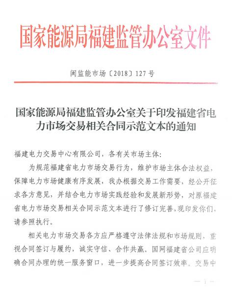 福建能監(jiān)辦日前發(fā)布了《關(guān)于印發(fā)福建省電力市場交易相關(guān)合同示范文本的通知(閩監(jiān)能市場〔2018〕127號)》,其中公布了福建省電力直接交易三方合同(示范文本)、福建省電力零售市場供電合同(示范文本)、福建省電力零售市場購售電合同(示范文本)、福建省電力市場化交易授權(quán)協(xié)議(示范文本)