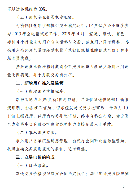 寧夏回族自治區(qū)工信廳日前發(fā)布了《關(guān)于組織開展2019年電力直接交易的通知》,按照有序推進、逐步放開的要求,依據(jù)交易規(guī)則,基數(shù)以外的電量需求全部進入市場。