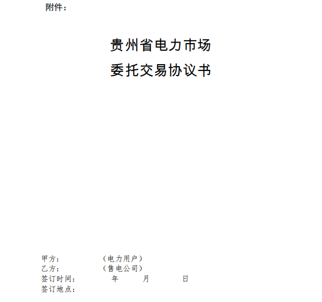 第八條 售電公司參與市場化交易前,需與代理電力用戶 建立購售電關(guān)系,并簽訂《貴州省電力市場委托交易協(xié)議書》 (詳見附件),提交交易中心并通過審核后,交易中心根據(jù)委 托交易協(xié)議書對售電公司及其代理購電的電力用戶進(jìn)行電力 交易系統(tǒng)授權(quán)。