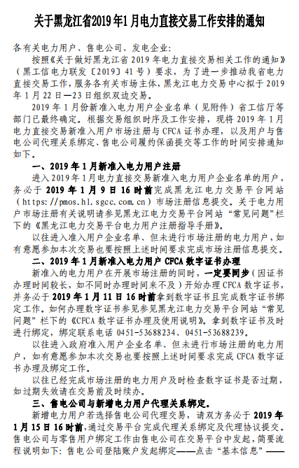 黑龍江電力交易中心發(fā)布了《關于黑龍江省2019年1月電力直接交易工作安排的通知》