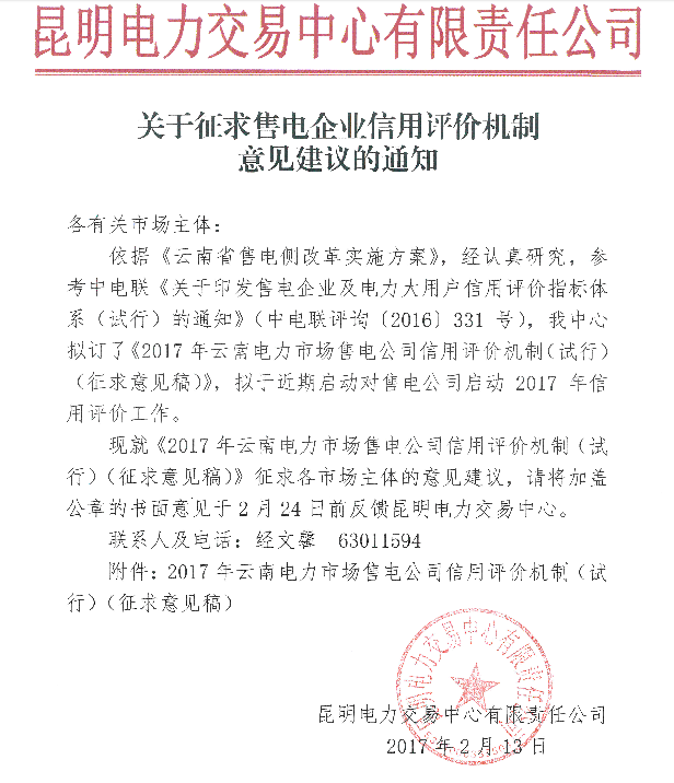 現(xiàn)就《2017年云南電力市場售電公司信用評(píng)價(jià)機(jī)制(試行)(征求意見稿)》征求各市場主體的意見建議,請(qǐng)將加蓋公章的書面意見于2月24日前反饋昆明電力交易中心。