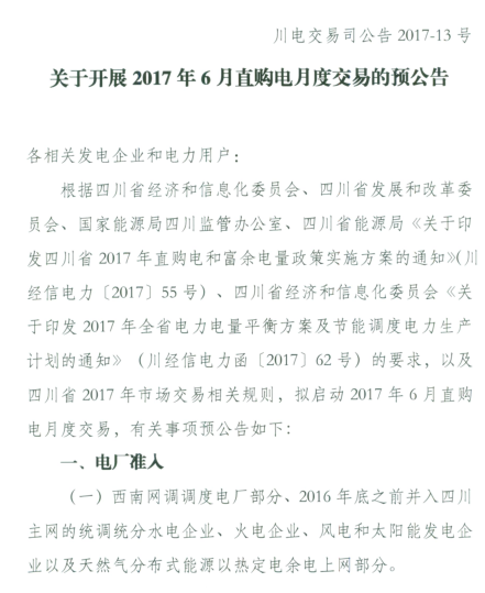 6月四川直購電月度交易即將展開 用電企業(yè)按水火7:3參與交易
