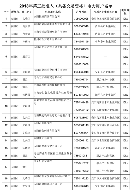 河南2018年第三批準入345家電力用戶全名單(具備交易資格)
