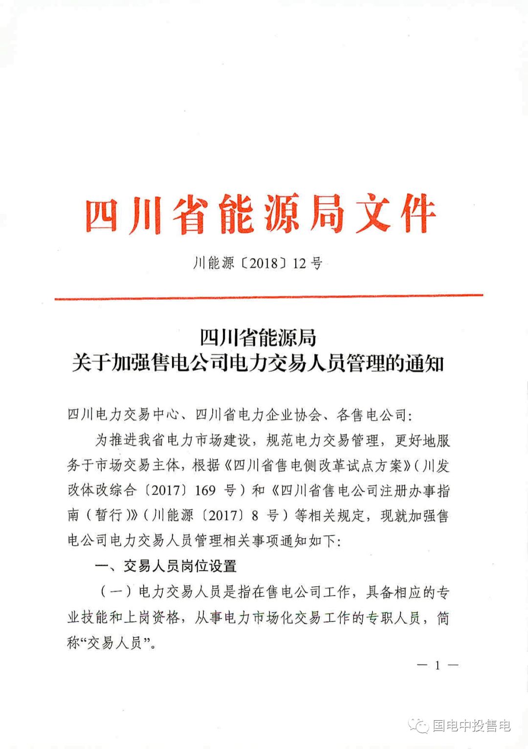 四川省能源局印發(fā)《關(guān)于加強售電公司電力交易人員管理的通知》,加強售電公司交易人員管理,提升交易人員專業(yè)性和規(guī)范性。四川成為全國首個專門出臺文件,對本省售電公司電力交易員定位、定崗、考核的省份。