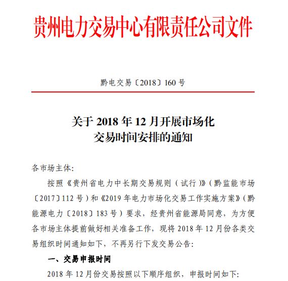 貴州電力交易中心日前發(fā)布了《關(guān)于2018年12月開展市場化交易時間安排的通知》,2019年一季度及1月月度雙邊協(xié)商交易申報時間為12月13日00:00至18日24:00。