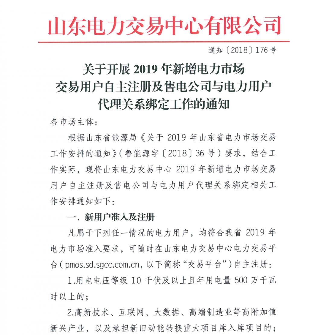 山東電力交易中心發(fā)布了《關(guān)于開(kāi)展2019年新增電力市場(chǎng)交易用戶(hù)自主注冊(cè)及售電公司與電力用戶(hù)代理關(guān)系綁定工作的通知》