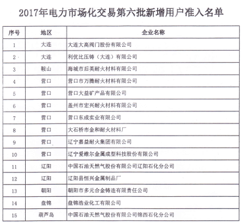 遼寧省工信委、國家能源局東北監(jiān)管局日前印發(fā)了2017年電力市場化交易第六批新增用戶準入名單的通知,名單中包含符合條件的15家企業(yè),詳情如下: