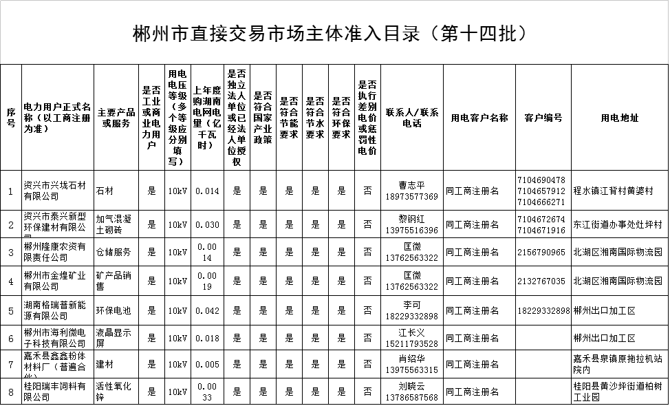 湖南郴州直接交易8家市場(chǎng)主體準(zhǔn)入目錄(第十四批)