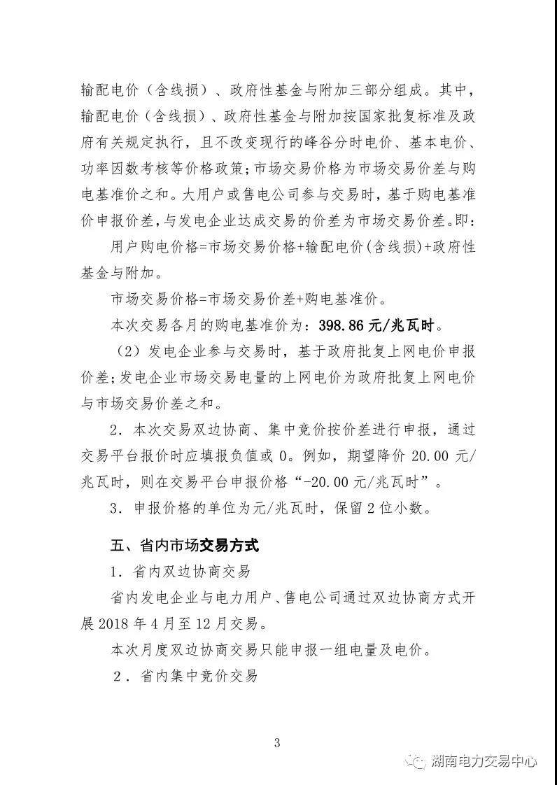 湖南電力交易中心日前發(fā)布了《關(guān)于2018年4-12月電力市場交易的公告》,公告中稱,本次交易電量對應(yīng)的周期為2018年4月-12月,按月申報并進行