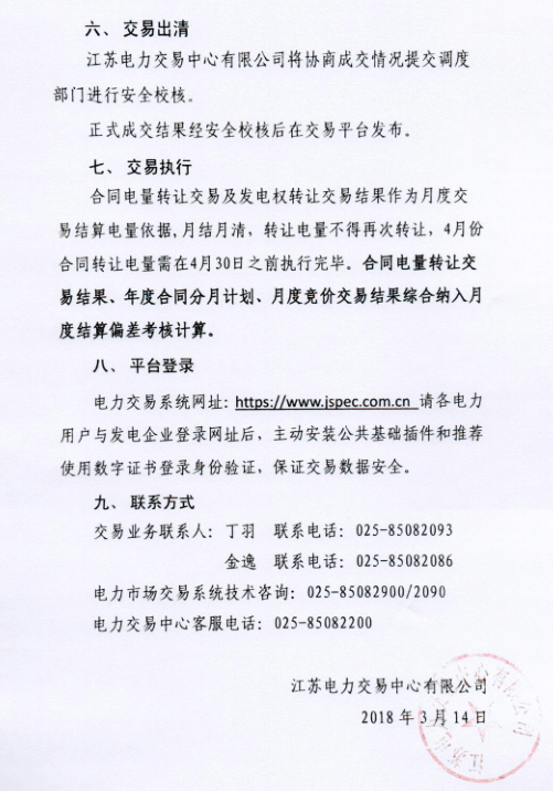 江蘇電力交易中心日前發(fā)布了《2018年4月江蘇省發(fā)電企業(yè)合同電量轉(zhuǎn)讓及發(fā)電權(quán)交易公告》,公告中稱,合同轉(zhuǎn)讓的電量為市場交易合同電量,售方獲得的40%基數(shù)獎(jiǎng)勵(lì)電量不隨交易轉(zhuǎn)讓。申報(bào)時(shí)間:3月26日上午9:30至16:00.
