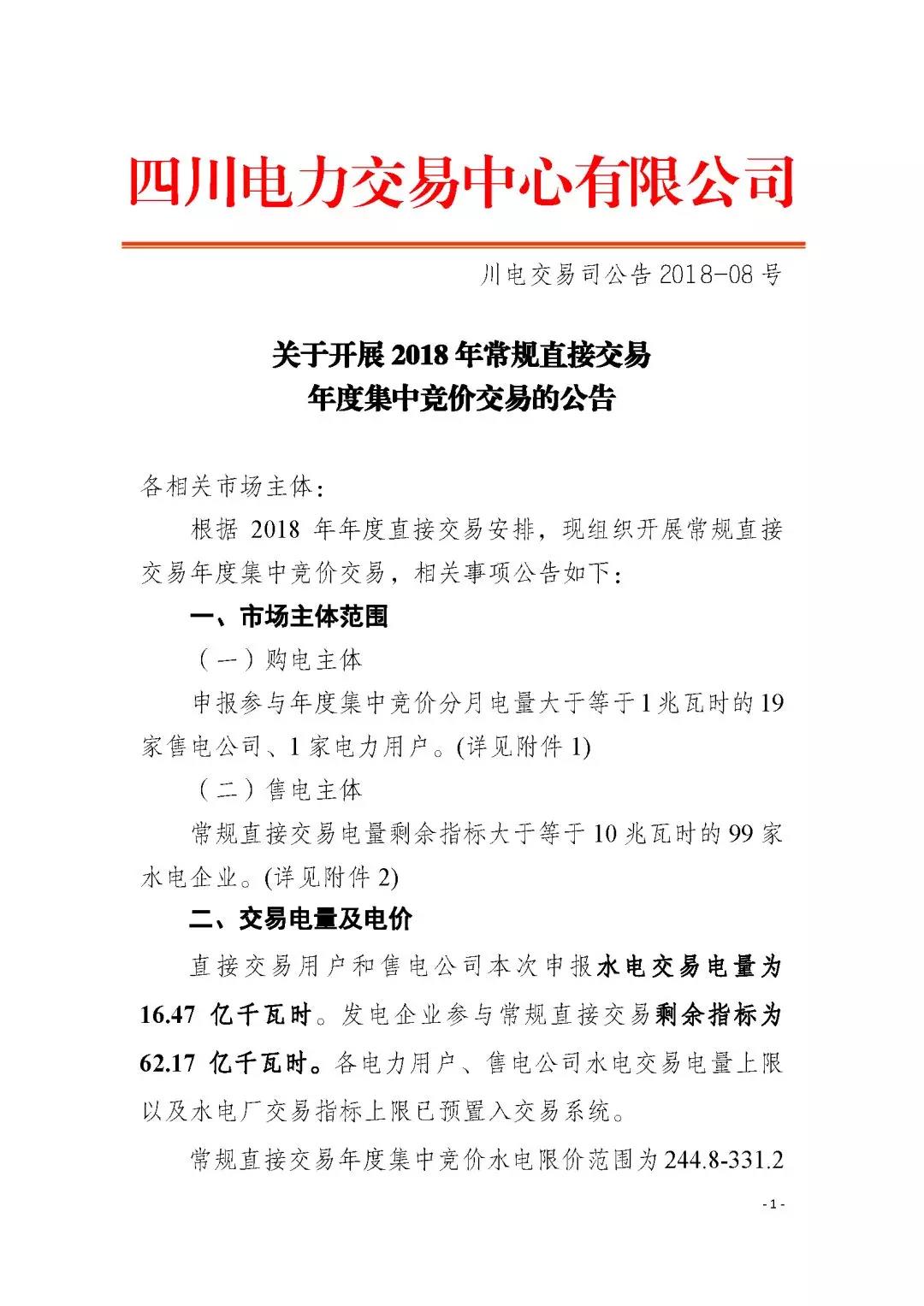 四川電力交易中心日前發(fā)布了《關于開展2018年常規(guī)直接交易年度集中競價交易的公告》,購電主體:申報參與年度集中競價分月電量大于等于1兆
