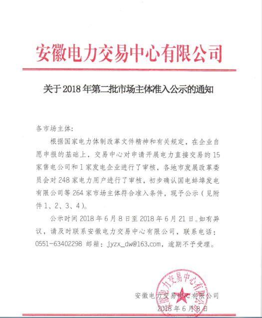 安徽電力交易中心日前發(fā)布了《關(guān)于開展2018年第二批市場主體準入公示的通知》,對申請開展電力直接交易的1家發(fā)電企業(yè)、15家售電公司進行了審核,各地市發(fā)展改革委員會對248家電力用戶進行了審核,初步確認國電蚌埠發(fā)電有限公司等264家市場主體符合準入條件,現(xiàn)予公示。公示時間2018年6月8日至2018年6月21日。