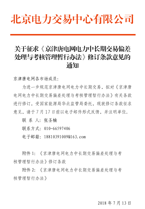 北京電力交易中心日前發(fā)布了關(guān)于征求《京津唐電力中長期交易偏差處理與考核管理暫行辦法》修訂條款意見的通知,此次修訂的條款為第十六條:因政策因素、電網(wǎng)因素及不可抗力造成的市場偏差,市場主體可在提交相應(yīng)的佐證材料后申請免考核。