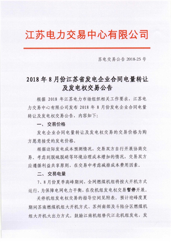 江蘇2018年8月份發(fā)電企業(yè)合同電量轉(zhuǎn)讓及發(fā)電權(quán)交易