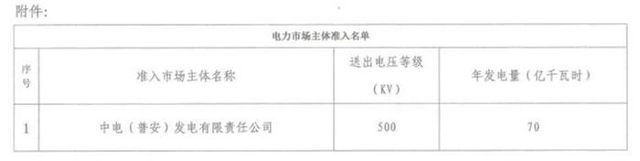 貴州省經(jīng)信委日前發(fā)布了 《關(guān)于對(duì)列入政府準(zhǔn)入目錄的電力市場(chǎng)主體進(jìn)行公示的通知》,同意將中電(普安)發(fā)電有限責(zé)任公司列入貴州電力市場(chǎng)主體準(zhǔn)入目錄,其年發(fā)電量為70億千瓦時(shí)。