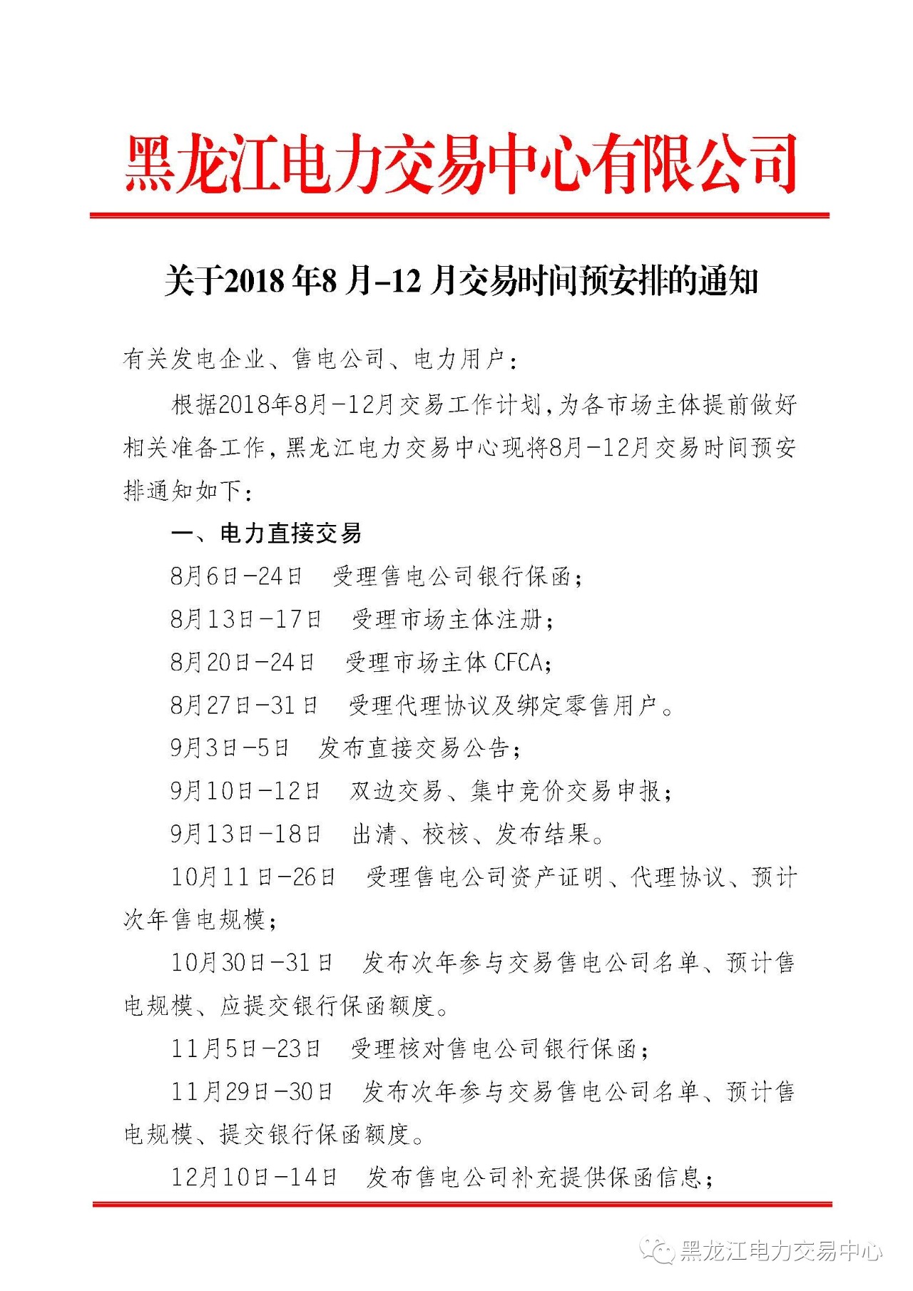 黑龍江電力交易中心日前發(fā)布了《關(guān)于2018年8月-12月交易時(shí)間安排的通知》。