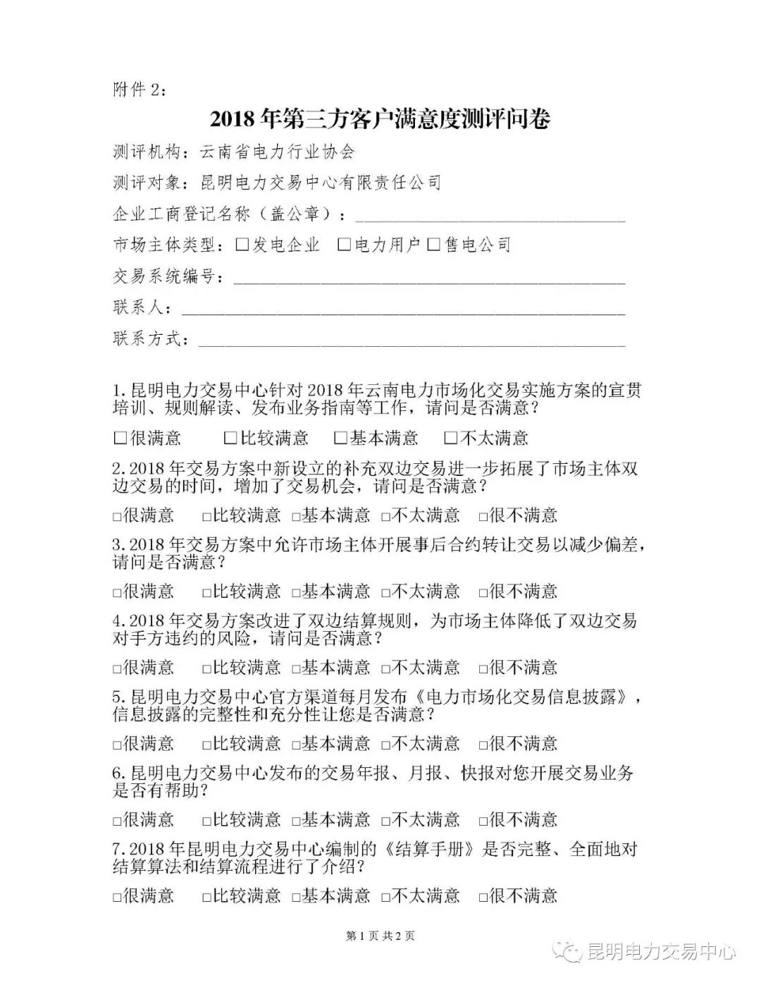 云南省電力行業(yè)協(xié)會關(guān)于組織對昆明電力交易中心有限責(zé)任公司開展2018年度第三方客戶滿意度測評的通知