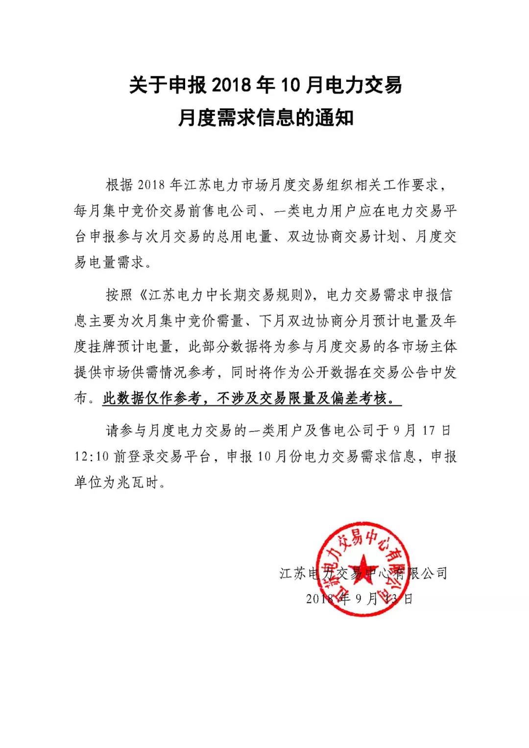 江蘇關(guān)于申報(bào)2018年10月電力交易月度需求信息的通知