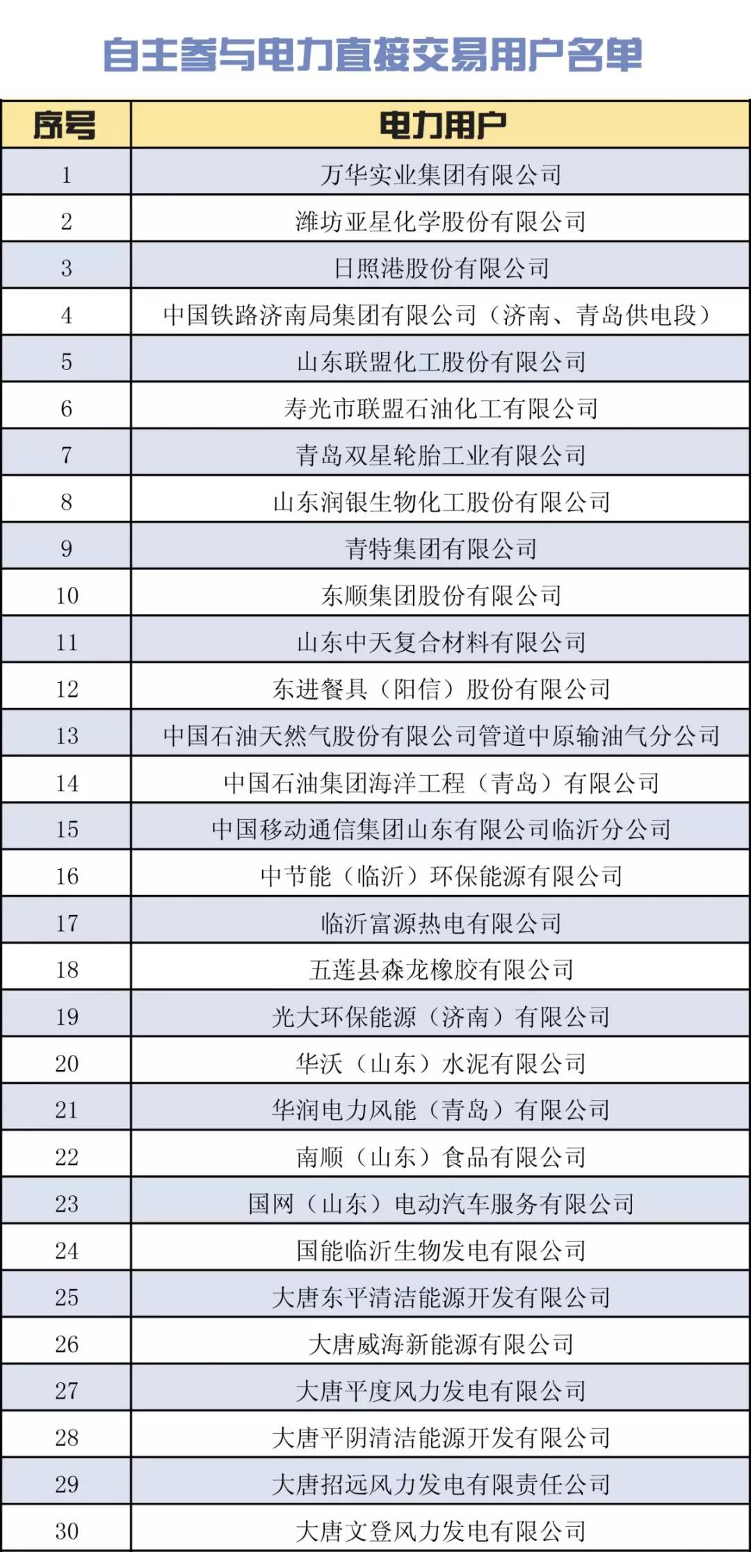 購(gòu)電方:在山東電力交易中心網(wǎng)站公示通過(guò)、完成注冊(cè)且已提交有效2018年跨省區(qū)電力用戶代理協(xié)議、省內(nèi)電力用戶代理協(xié)議的售電公司;省經(jīng)信委準(zhǔn)許并在山東電力交易中心網(wǎng)站完成注冊(cè)、可自主參與2018年跨省區(qū)電力直接交易的電力用戶和省內(nèi)電力直接交易的電力用戶(詳見(jiàn)下表)。