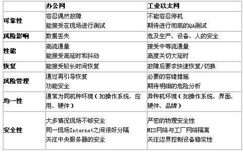 MES系統(tǒng)的防護相對特殊,既要直接采集來源于生產(chǎn)現(xiàn)場的數(shù)據(jù),同工廠生產(chǎn)車間中的各項終端設(shè)備都會進行直接的數(shù)據(jù)交互,而且也要同上層的ERP系統(tǒng)進行通訊,因此MES系統(tǒng)在大多數(shù)企業(yè)中,為了方便與ERP系統(tǒng)之間的數(shù)據(jù)交互與員工訪問,通常會劃分在辦公網(wǎng)的安全防護體系中。但是,實際上由于MES系統(tǒng)能夠直接對工業(yè)控制系統(tǒng)進行訪問,因此,對于MES系統(tǒng)的防護應(yīng)該提升其系統(tǒng)防護級別,將MES系統(tǒng)與辦公網(wǎng)進行隔離。工廠信息安全中最為基礎(chǔ)的部分就是工業(yè)以太網(wǎng),所以工業(yè)以太網(wǎng)網(wǎng)絡(luò)首先得必須保證7*24*365天的可用性,必須能夠不間斷的可操作,能夠確保系統(tǒng)的可訪問性,數(shù)據(jù)能夠?qū)崟r進行傳輸,需要有完備的保護方案。工業(yè)以太網(wǎng)與普通辦公網(wǎng)具體區(qū)別如下表所示: