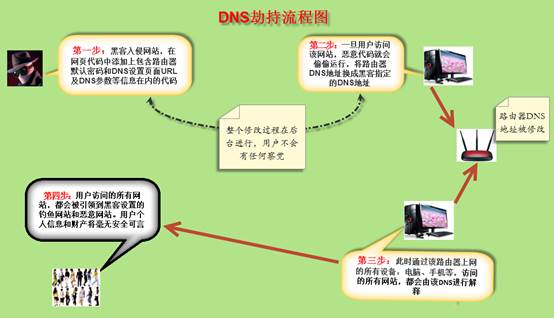 據(jù)趙昱表示,黑客攻擊家用路由器一般有三個(gè)步驟:第一,破解網(wǎng)民家里的WiFi密碼;第二,接入WIFI之后,再破解路由器管理后臺(tái)的賬號(hào)和密碼,獲得路由器管理權(quán);最后,在路由器中植入后門程序,竊取網(wǎng)民上網(wǎng)信息,或者篡改路由器DNS設(shè)置,使得網(wǎng)民在不知情的情況下訪問(wèn)釣魚(yú)欺詐網(wǎng)站。