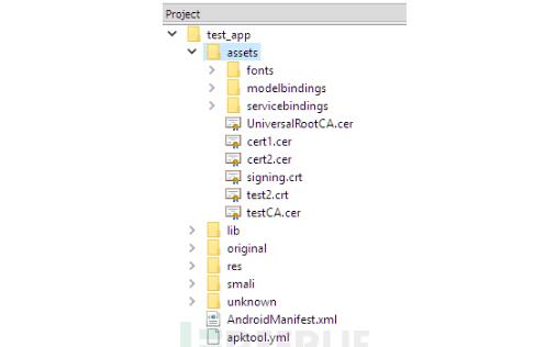 使用APK Studio之類的工具打開(kāi)APK文件,然后在窗口中找到應(yīng)用程序所捆綁的證書。在上圖中,證書位于應(yīng)用程序的assets目錄下。接下來(lái),用我們自定義的CA覆蓋應(yīng)用程序原本的CA(‘UniversalRootCA’證書),這樣就可以讓應(yīng)用程序直接信任我們的證書了并實(shí)現(xiàn)流量攔截了。