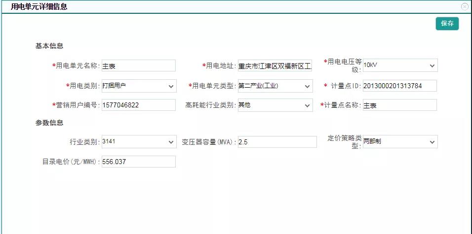 點擊用電單元名稱,進行用電單元信息界面,補充完整用電單元信息(用電單元類型、高耗能行業(yè)類別需重新選擇),后保存即可。