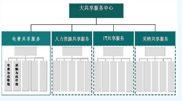 因此,“電費核算云”是共享服務的一種有益的嘗試,隨著共享服務模式的運作與成熟,以及售電主體業(yè)務發(fā)展的需要,人力資源管理、采購物流管理與IT的部分內(nèi)容也可以逐步納入共享范圍,此時,“電費核算云”就成為大共享中心組織的一個分支(見下圖):