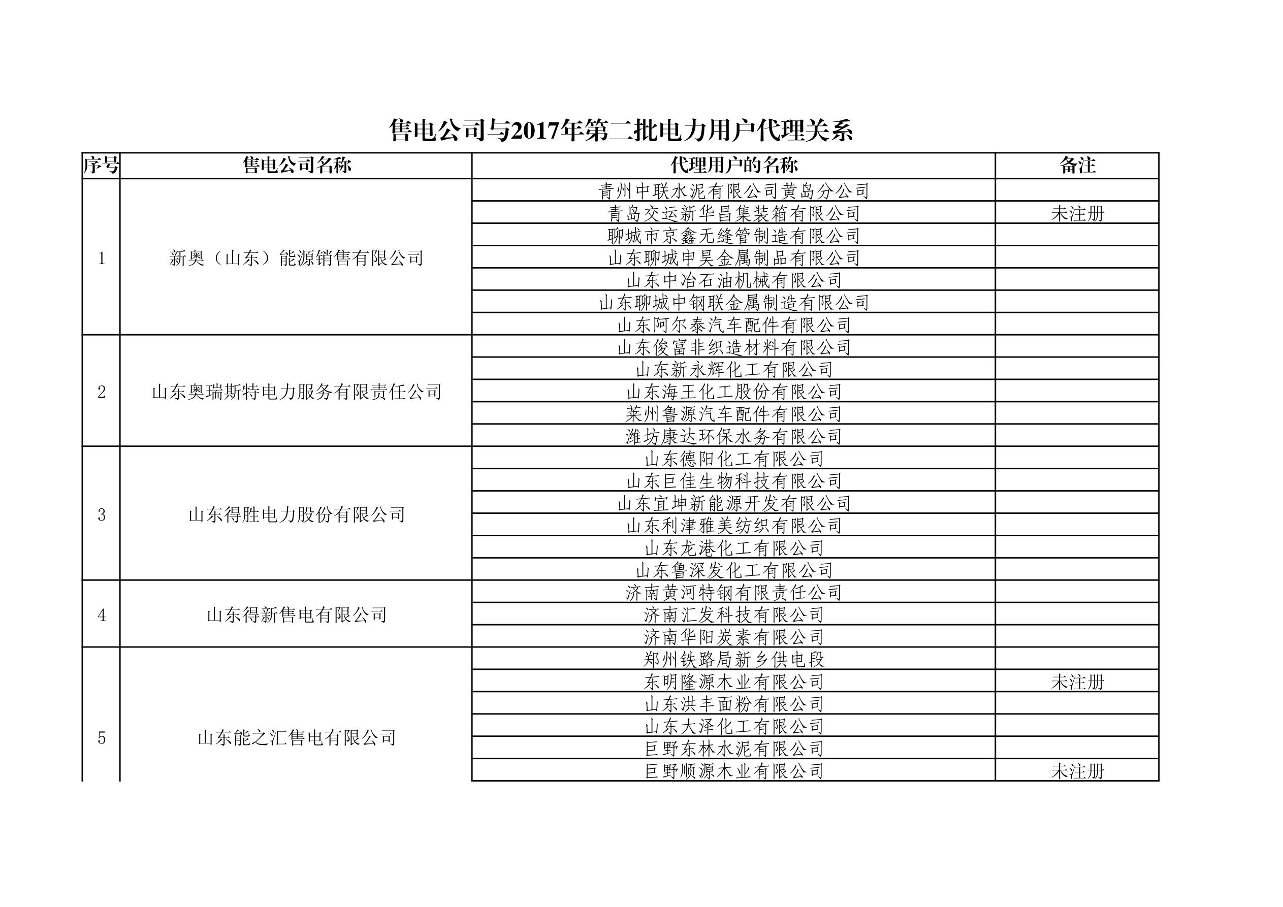 根據(jù)山東省經(jīng)信委、山東省物價局和山東能源監(jiān)管辦聯(lián)合印發(fā)的《關(guān)于做好2017年省內(nèi)省外電力市場交易銜接調(diào)整工作的通知》(魯經(jīng)信電力〔2017〕336號)要求,山東電力交易中心有限公司受理了售電公司提交的省內(nèi)第二批電力直接交易用戶的代理協(xié)議。經(jīng)審核后,售電公司與電力用戶代理關(guān)系及自主參加交易的電力用戶名單公布如下(詳見附件)。根據(jù)《關(guān)于做好2017年省內(nèi)省外電力市場交易銜接調(diào)整工作的通知》(魯經(jīng)信電力〔2017〕336號)要求,多個售電公司重復提交一個用戶代理協(xié)議的,取消該用戶委托售電公司代理交易資格,該用戶只能自主參與直接交易;未在交易平臺注冊的電力用戶,請于2017年8月21日前完成注冊,否則將無法參與電力直接交易。