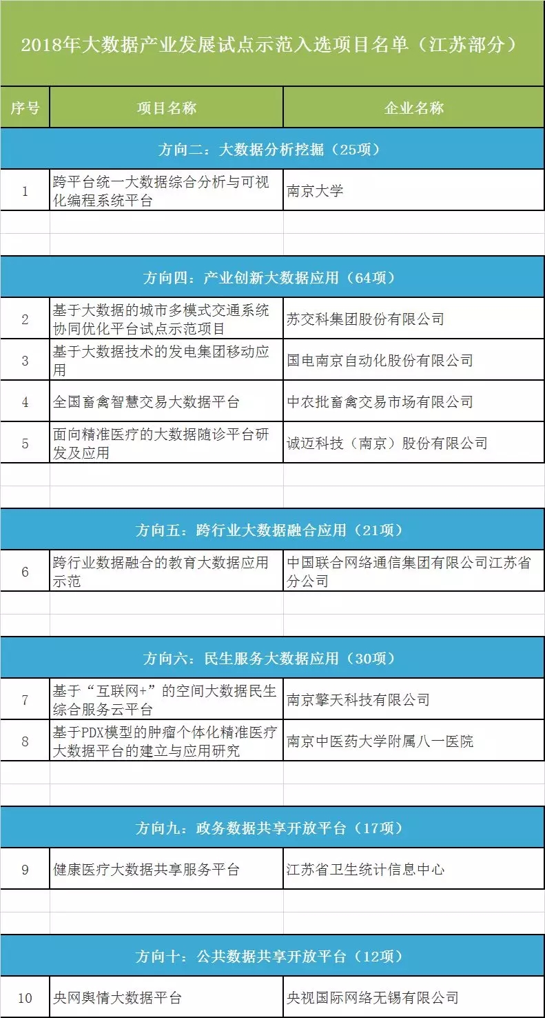 工信部11月公布的2018年大數(shù)據(jù)產(chǎn)業(yè)發(fā)展試點(diǎn)示范項(xiàng)目中,江蘇10個(gè)項(xiàng)目入選。