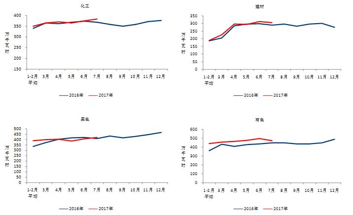 7月份,四大高載能行業(yè)用電量合計1579億千瓦時,同比增長4.6%,增速比上年同期提高4.0個百分點,占全社會用電量的比重為26.0%。其中,化工行業(yè)用電量384億千瓦時,同比增長5.7%,增速比上年同期提高4.8個百分點;建材行業(yè)用電量305億千瓦時,同比增長5.9%,增速比上年同期提高0.7個百分點;黑色金屬行業(yè)用電量418億千瓦時,同比增長1.3%,增速比上年同期提高5.9個百分點;有色金屬冶煉行業(yè)473億千瓦時,同比增長5.9%,增速比上年同期提高3.5個百分點。